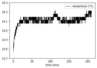 恒温槽の温度は25℃に設定したがデジタル温度計の示度は24℃と低い値を示した。またノイズだけでなく、大きくドリフトしている。0.5~3.5時間の統計量は以下のようになった。